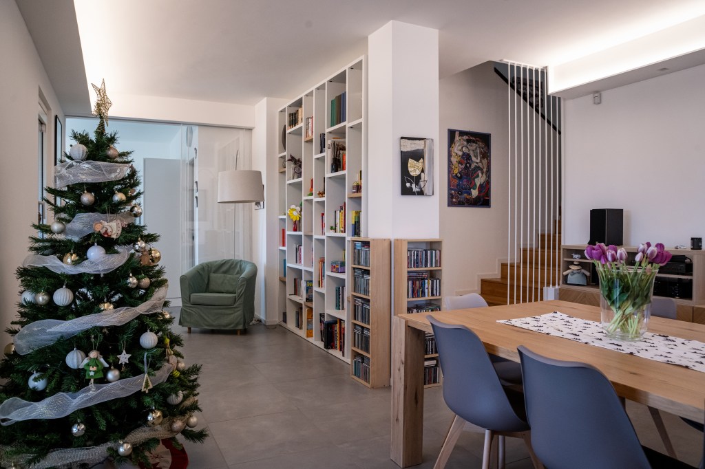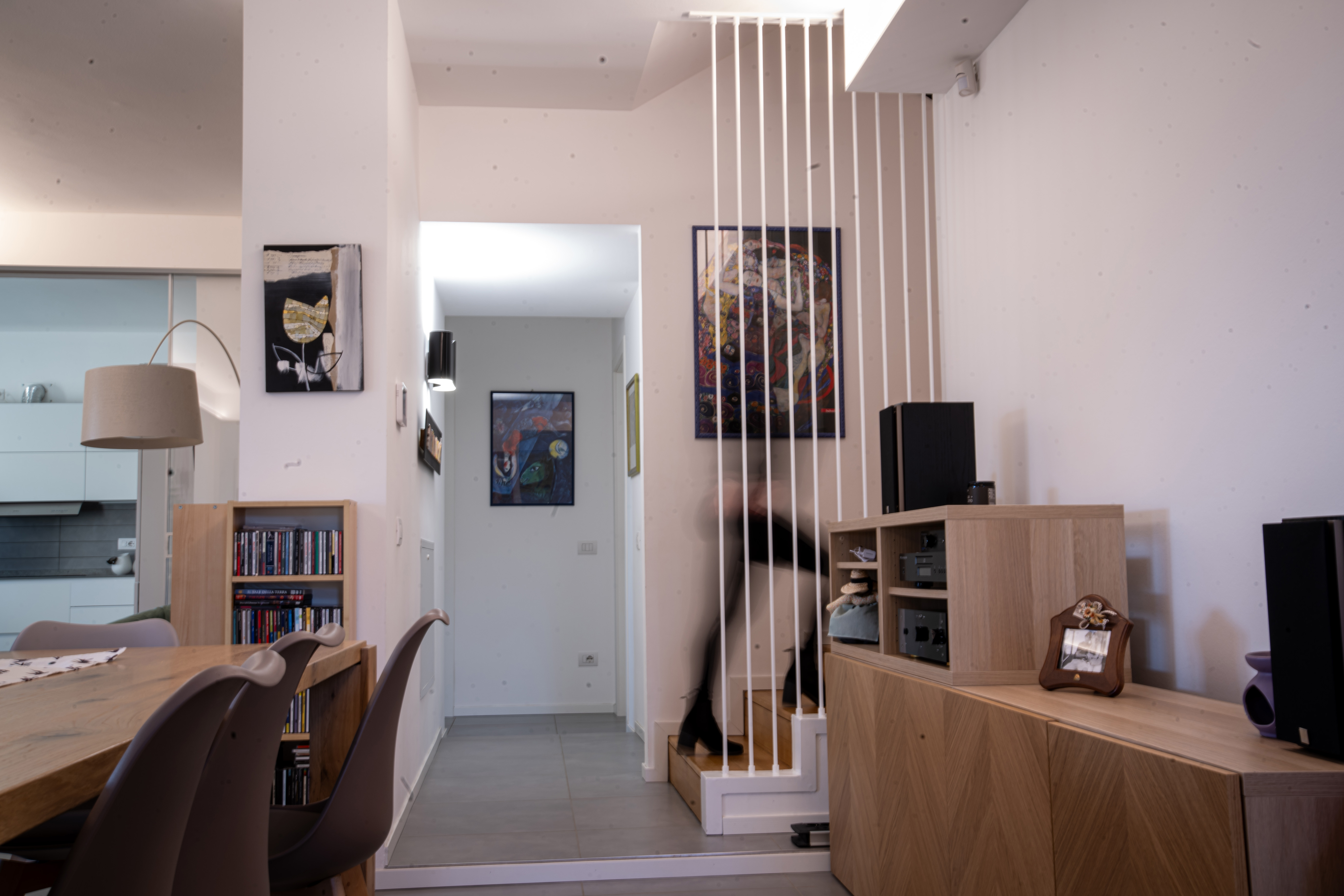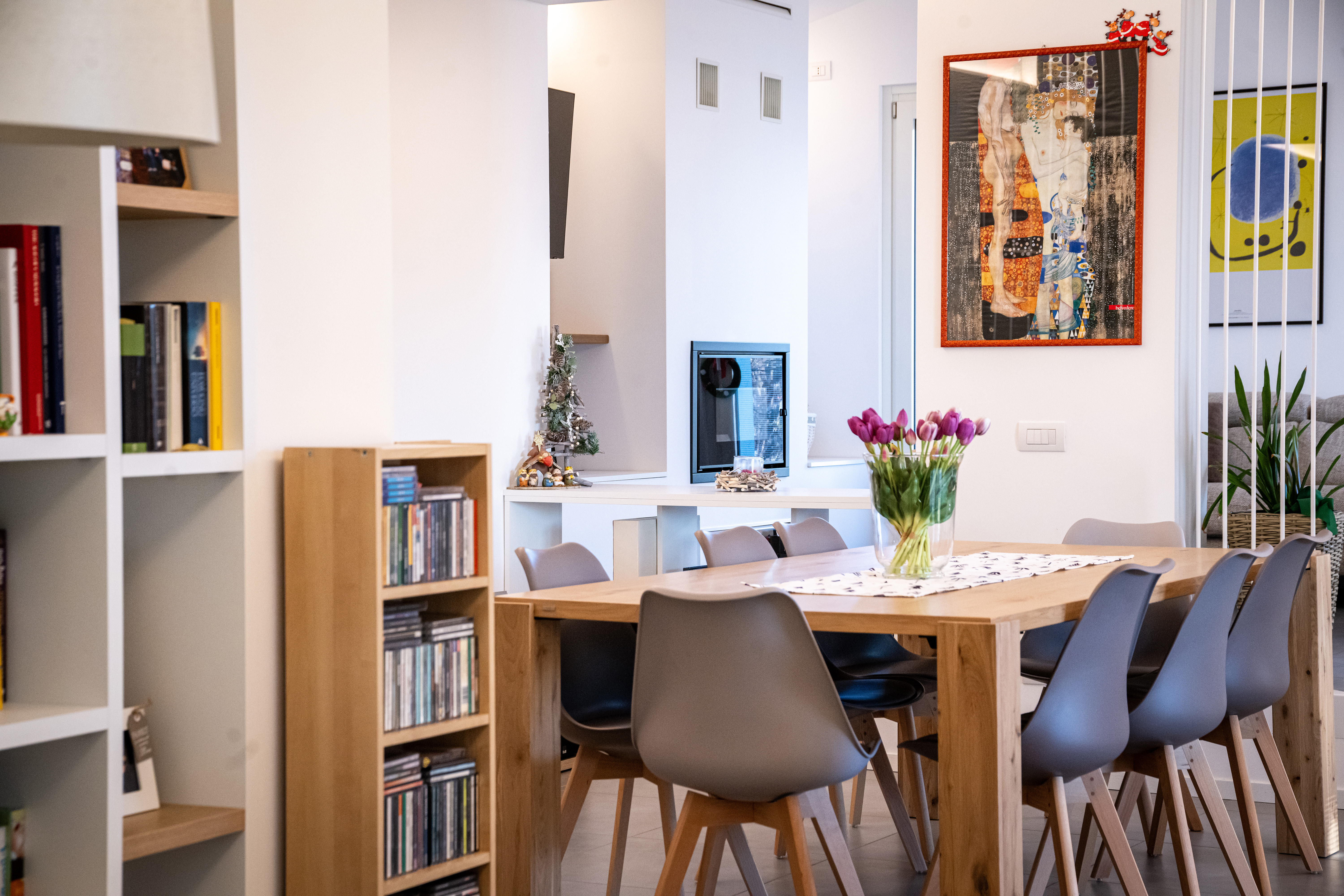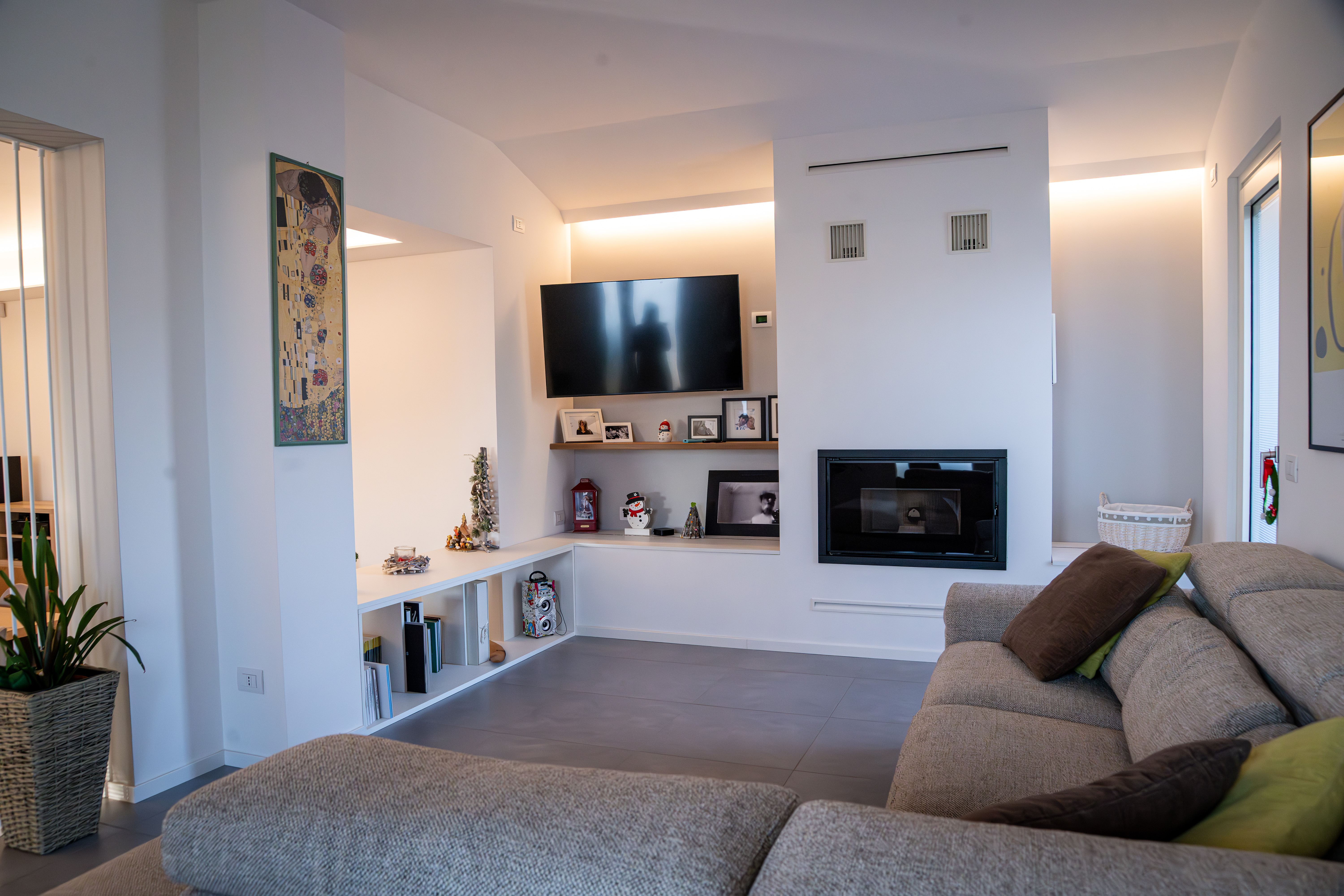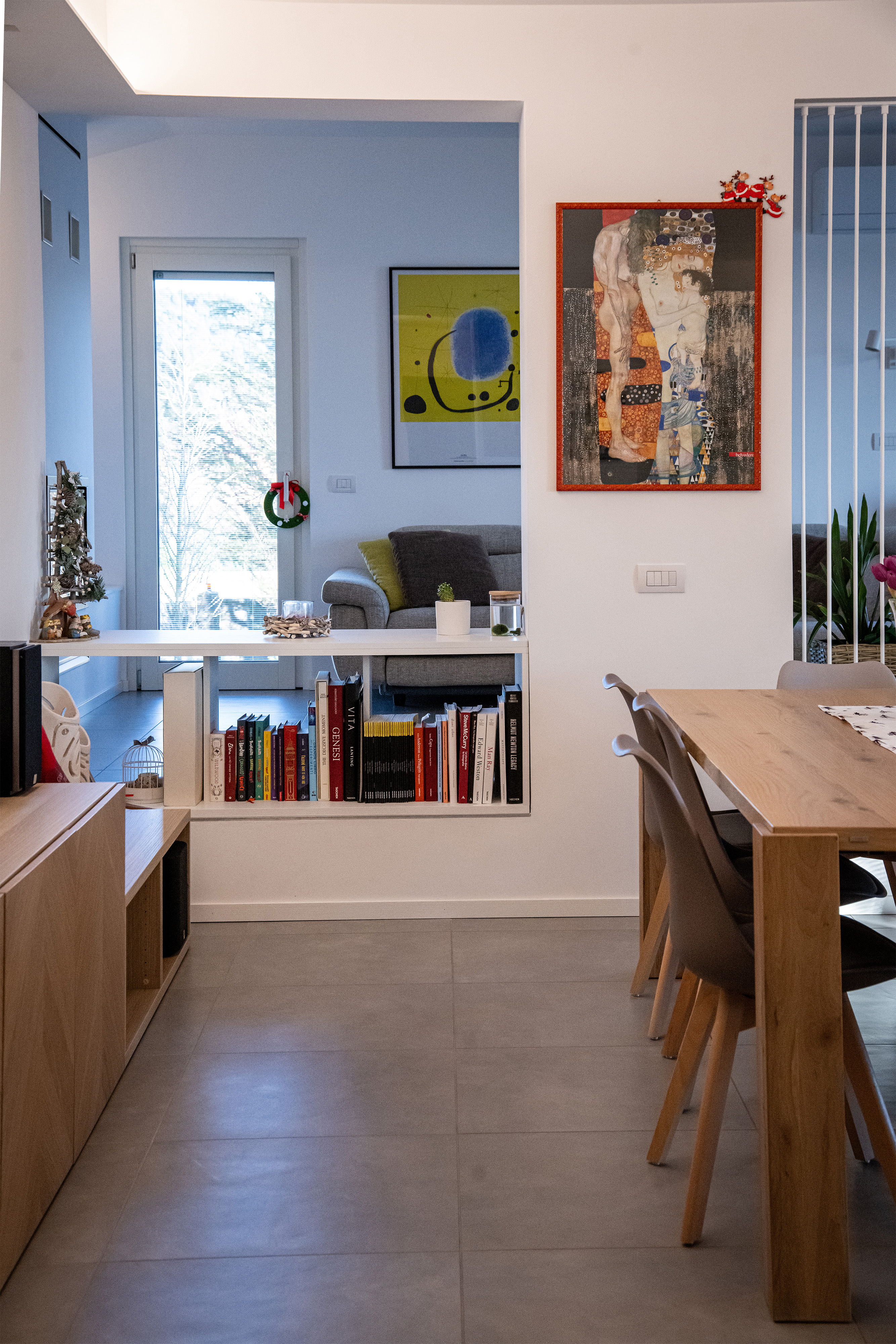 Per quanto concerne lo sbalzo di altezza con la zona soggiorno un mobile su misura collega direttamente la parete della zona camino con la zona del pranzo, il mobile si trasforma da libreria a spazio contenitivo per dispositivi elettronici sotto la televisione per poi diventare uno spazio contenitivo per il pellet alla destra del camino.