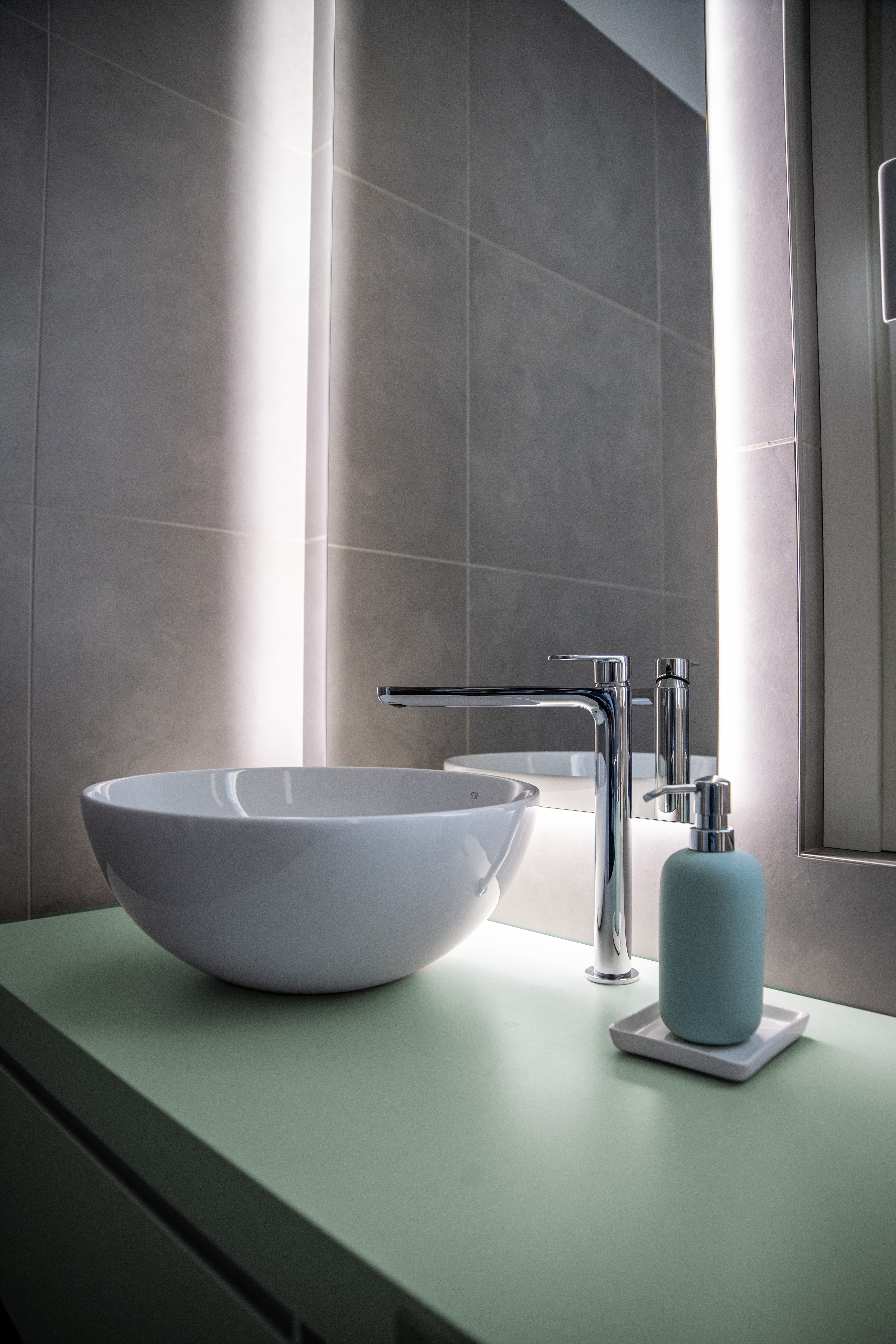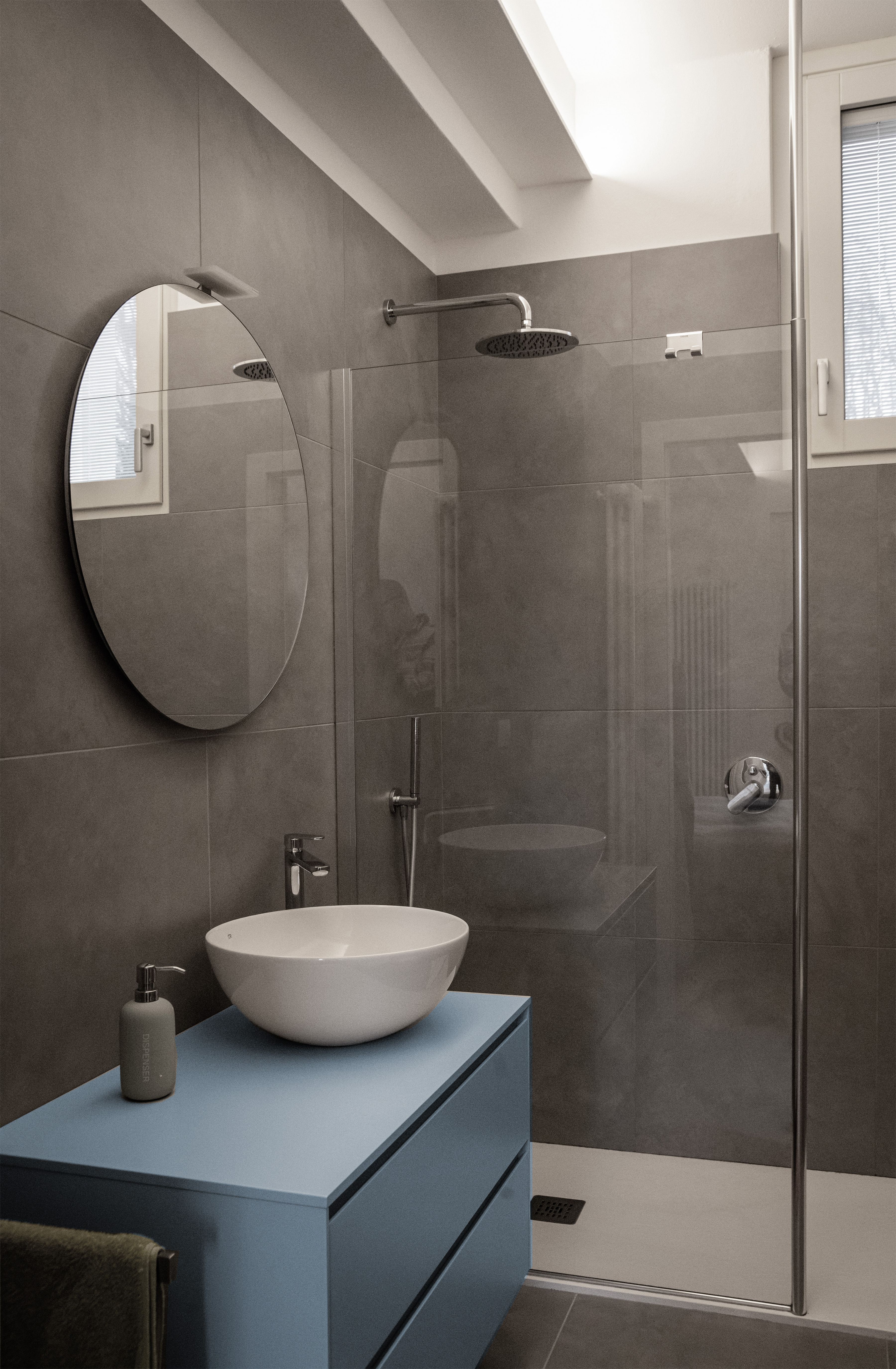 I bagni semplici nel loro aspetto estetico sono stati studiati in diverso modo grazie all’uso di colori pastello per il mobilio. A piano terreno un colore verde chiaro che richiama la vista esterna della natura, il bagno padronale invece è accompagnato da un colore azzurro ghiaccio visto l’accostamento con il pavimento della camera in parquet rovere.