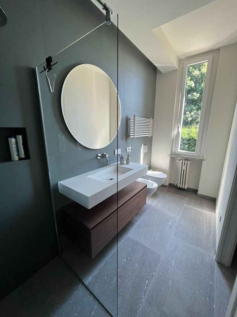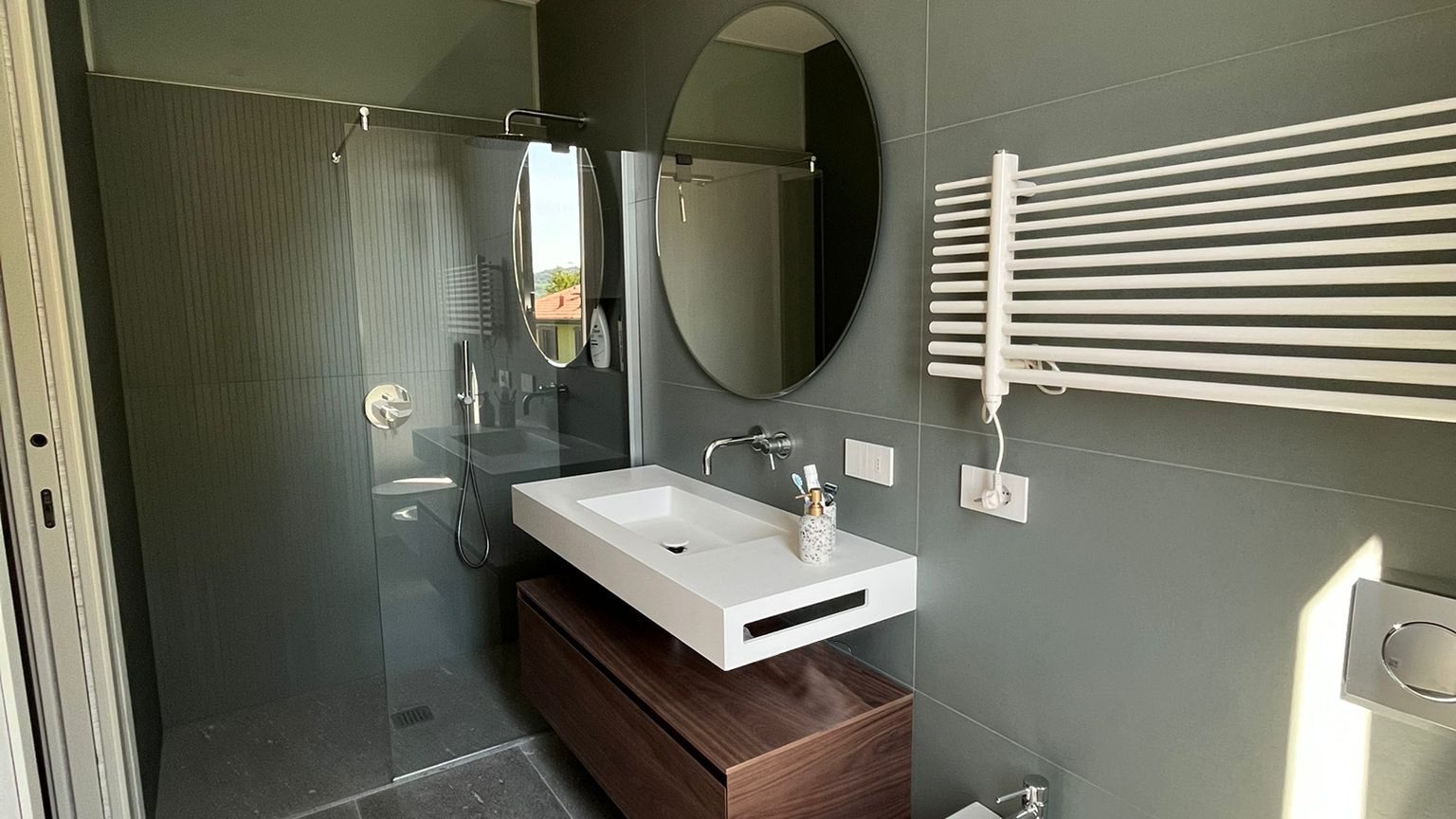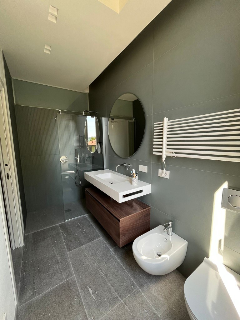 Per una coppia di giovani sposini mi è stato chiesto di dare un sapore ai loro bagni in fase di ristrutturazione. I due bagni sono accompagnati dal pavimento in pietra uguale in tutta la casa. I colori scelti sono colori naturali che richiamano uno stile Boho. Un bagno blu cielo con la piastrella Nuances di Italgraniti e un bagno Salvia con la piastella della medesima linea. Per entrambi i bagni i mobili sono con la finitura noce canaletto.